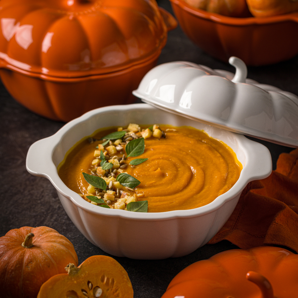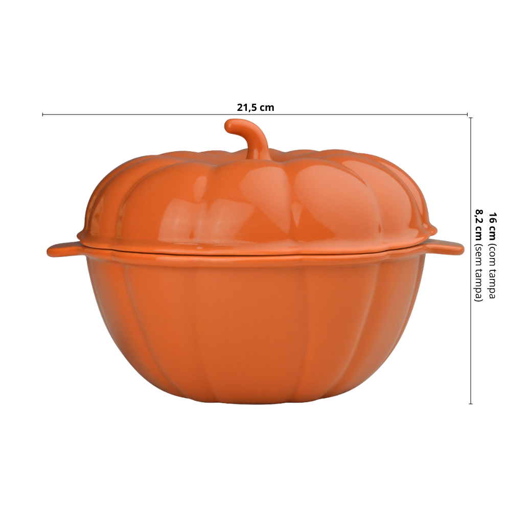 Seu design em formato de abóbora com tampa traz charme e sofisticação à apresentação, sendo perfeita para servir sopas, caldos, cremes, gratinados e outras receitas.