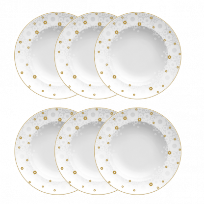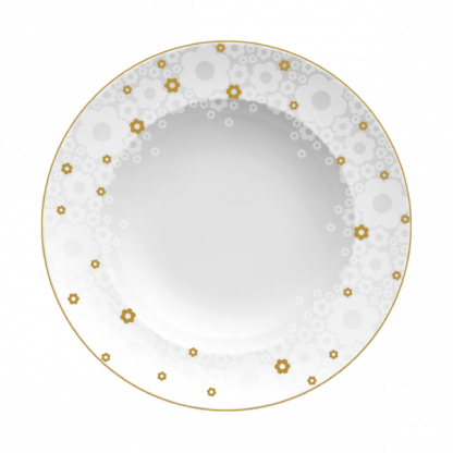 Inspirada na flor buquê de noiva, a estampa dessa coleção lembra uma renda delicada e elegante, porém, com toque pop e atemporal. Nas cores branco e dourado é a escolha ideal para quem busca um estilo descomplicado para porcelanas de uso cotidiano.